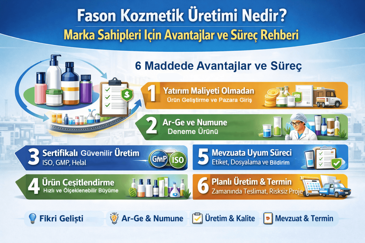 Fason kozmetik üretimi (private label kozmetik), bir markanın kendi adıyla piyasaya süreceği kozmetik ürünleri; üretim altyapısına, teknik ekibe ve kalite sistemine sahip bir üretici tesis üzerinden geliştirmesi ve seri üretime aldırmasıdır. Bu model, doğru kurgulandığında markalara iki önemli avantaj sağlar: yatırım yükünü azaltır ve pazara çıkış hızını artırır. Ancak fason üretim; yalnızca “üretimi dışarıda yaptırmak” değildir. Ürün stratejisinden mevzuat uyumuna, Ar-Ge’den kalite güvenceye, ambalajdan termin yönetimine kadar profesyonel bir proje yaklaşımı gerektirir.